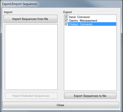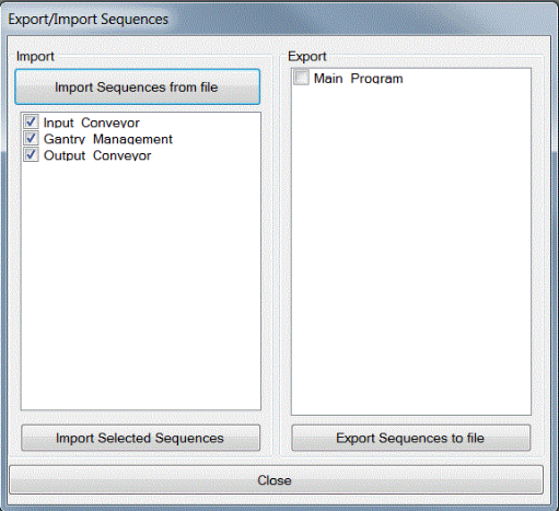 To access the sequence management tool, navigate to the Program menu and select Export/Import Sequences.