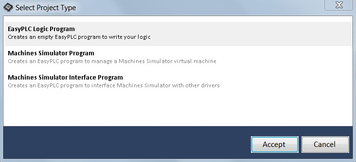 - EasyPLC Logic Program: Generates a blank program structure with a simulated driver. This is the standard template for custom EasyPLC applications, allowing full manual control over adding, modifying, or removing drivers and sequences.