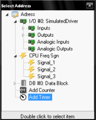 Clicking in the Address column of each variable allows for easy assignment to available PLC objects such as analog/digital I/O, CPU frequency signals, data blocks, counters, or timers. Once the column button is clicked, the Select Address window appears; a double-click selects the item to link with the variable.