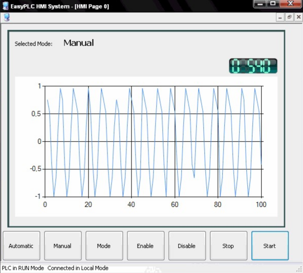 Below is an example of an HMI screen interacting with the Virtual PLC CPU. Using command buttons, users can modify PLC variable values in real-time, while chart controls provide a graphical representation of variable data.