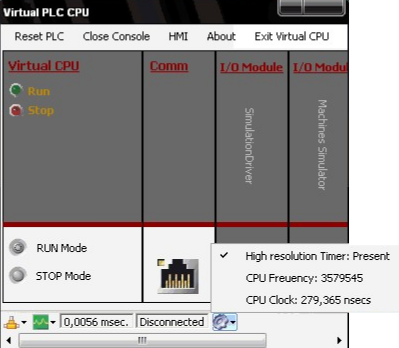 Running the Virtual PLC on a computer with a High-resolution timer is recommended to achieve the fastest scan cycles. The displayed CPU Frequency and CPU Clock values provide an overview of the computer's capacity to execute logic programs efficiently.