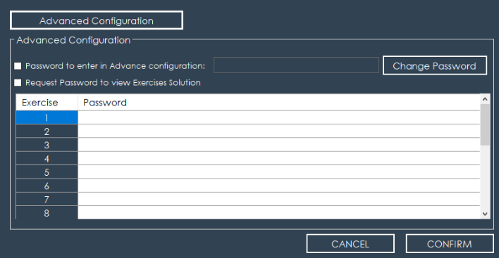 • Solution Security: You can assign individual passwords for each of the 20 exercises to control when users are allowed to view the proposed solutions.