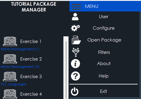 • Open Package: Use this option to load a different tutorial package (if purchased or created). Each package contains a unique set of exercises and solutions.
